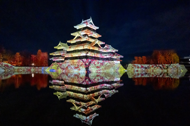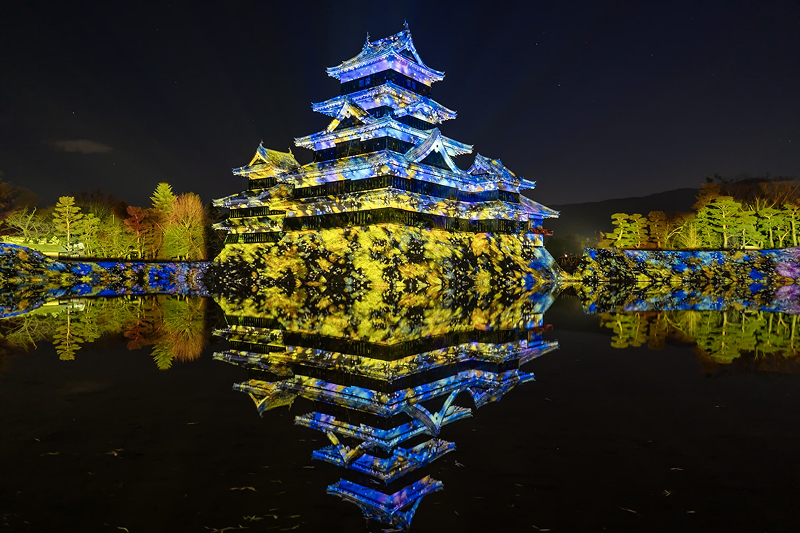 国宝松本城の天守や石垣にダイナミックで幻想的なプロジェクションマッピング映像を投影。普段と違った幻想的な空間をお楽しみください。