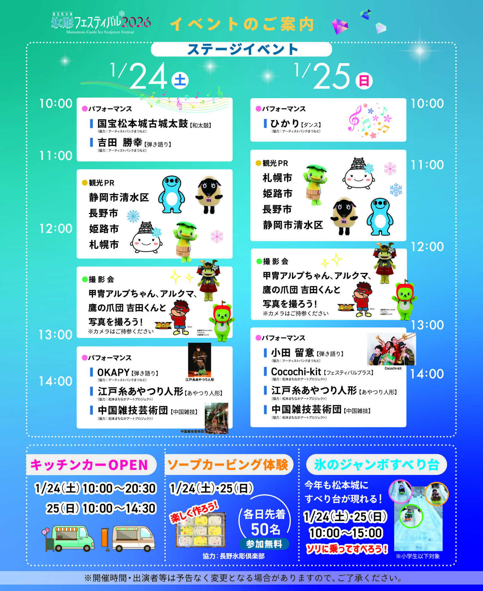 2026.01.19 【氷彫フェスティバル】イベントスケジュール決定! 1月24日(土)、25日(日)に松本城公園にて開催する国宝松本城氷彫フェスティバル2026のステージイベントスケジュールが決定しました。 日時:1月24日(土)10:00~15:00 1月25日(日)10:00~15:00 場所:松本城公園 特設ステージ スケジュール:以下のとおり ※雨天等により時間の短縮または中止となる場合があります。